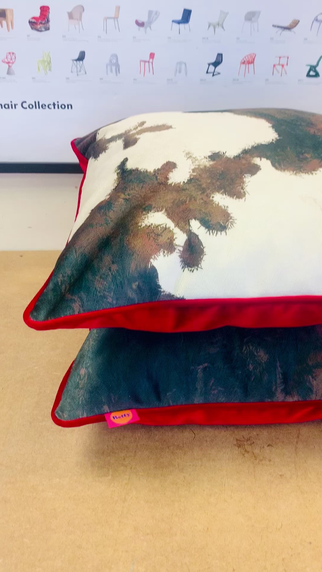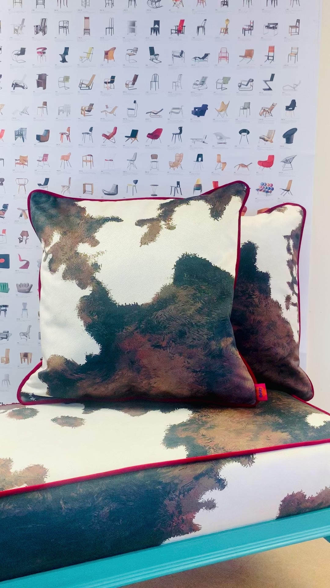 UNIQUE COWHIDE scatter cushions, handmade with Linwood Omega velvet backs and contrast hidden orange zips, a real STATEMENT for any space